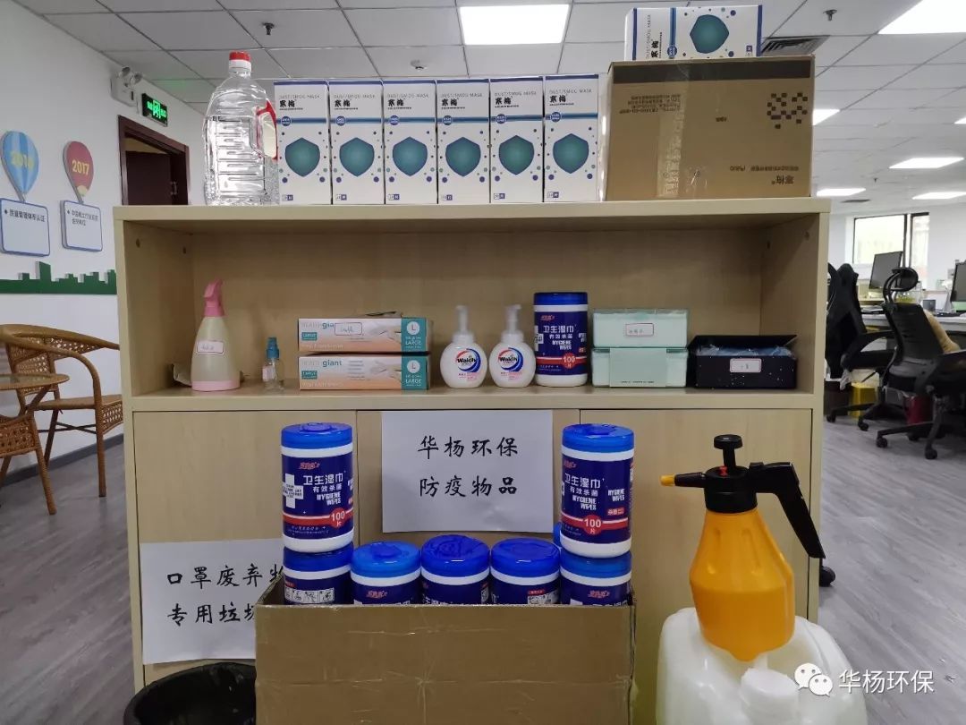 华杨环保为员工采购了KN95口罩、一次性手套、84消毒液、医用酒精、酒精棉、洗手液、消毒湿巾等物资,确保大家陆续复工后的日常需求。